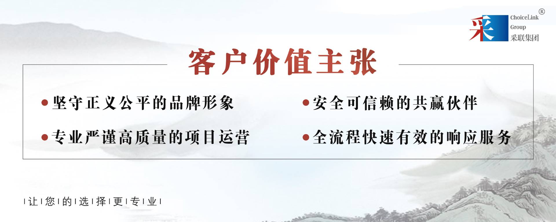 采聯(lián)集團致力于為廣大客戶提供采購全流程專業(yè)服務,堅守“守正出奇”的核心價值觀,以公平公正為原則,不斷優(yōu)化服務、堅持創(chuàng)新發(fā)展。依托多元化、專業(yè)化的服務,不斷向“締造最具創(chuàng)新力的采購服務品牌,構筑采購領域最專業(yè)的資源交互平臺”的遠大愿景邁進。